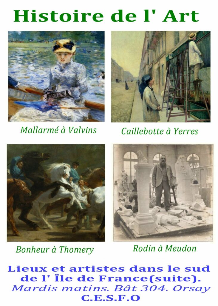 | Programme 2025-2026 : le programme portera sur le patrimoine en Île-de-France (sud) – 3ᵉ partie. Nous maintenons la formule de quatre séances annuelle en présentiel, au bâtiment 304 de l’Association CESFO, Université Paris-Saclay (Orsay Vallée). – Chaque séance dure 2h30, de 10h30 à 13h. – Elles peuvent également être suivies en visioconférence, sur demande. – Chaque rencontre comprend une présentation de 1h45, suivie d’un temps d’échange et de discussion. Calendrier des séances : 1. Mallarmé, Morisot, Degas, Renoir, Gauguin, Redon. Mardi 16 décembre 2025. 2. Yerres, Caillebotte, Manet, Monet… Mardi 3 février 2026. 3. Thomery, Rosa Bonheur. Mardi 17 mars 2026. 4. Meudon, Rodin/ Egreville, Bourdelle/Nogent/Seine, Claudel. Mardi 5 mai 2026. |